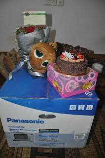 Ibu dapat kek coklat lapis dengan blueberry..yummy! bunga ros segar, baby kura-kura dengan ibunya dan juga microwave oven...abah kata, boleh guna masa ibu pantang nanti. Terima kasih abah. ibu sayang sangat kat abah. Insyaallah..birthday abah thn depan kita sambut. Tahun nie ibu tengah pregnant, takleh nak merayap beli hadiah abah.